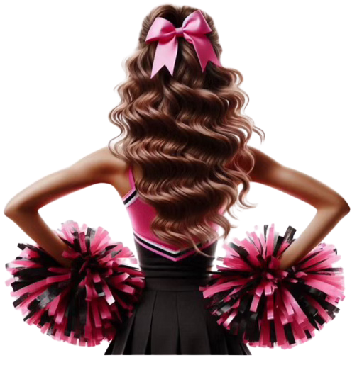Mystery CHEERLEBRITY Cheerleading Camp guest instructor drawing of cheerleader in pink and black uniform with her back towards the viewer